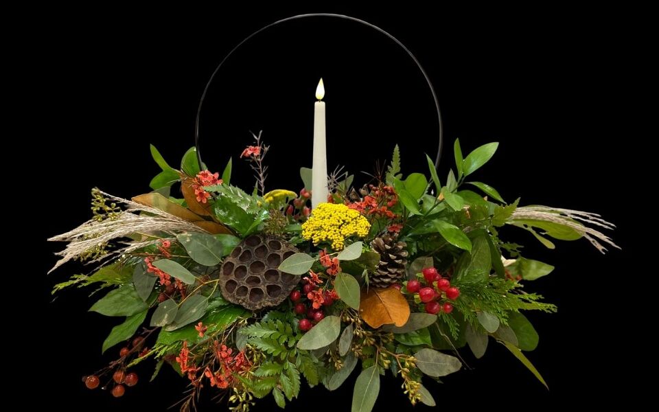 A warm and inviting seasonal centerpiece featuring a glowing taper candle framed inside a modern metal ring. Designed with a mix of fresh greenery, natural textures, and pops of seasonal color, this arrangement brings a soft, elegant glow to any table or gathering.